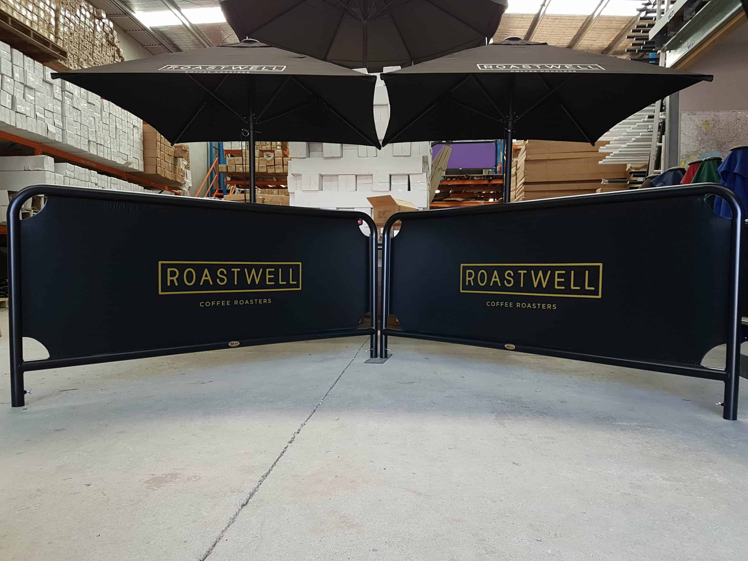 48mm round tube Cafe Barriers with stretched vinyl or premium acrylic fabric insert. Frames are available in satin black powder coat or custom colours are available.